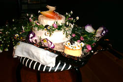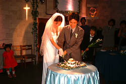 | 新郎新婦入場です。入場がいやに早くなかったか? | 渡久地さん、ぱらの共作ウェディングケーキだ。私も「切りたい!」 |