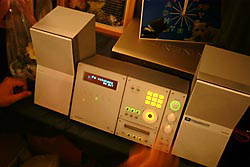 | 無事??でもないが、経大卒業が決まった永田と、大垣女子短大卒業がほぼ決まったなおちゃんだ。でもカップルじゃーないんだこれが。 | このダンボールのようなモノはMDコンポなんだ。機能的デザインがかっこいい。CDプレイヤーのスライドは感動。 |