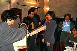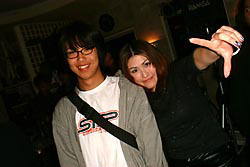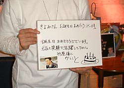 | ひろりんだ。今日は風邪をひいていたらしくずっとえらそうだった。だがしかし、私のワインをほとんど飲んでしまい、ついには渡久地さんにシェリー酒をもらい、さらに「スパークリングワインをあけるよー」と聞くと、そのシェリー酒を一気に飲みほす、という快挙をなしとげた。はっきし言ってあんたは「酒豪」です。 | たけちゃんからもメッセージ。かわいいね。 |