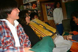 | 「IAMAS」こと情報アカデミー出身の南川。なんやらコートなどの防寒具が多かった。彼は最近風邪をひいてたいへんだった。それを考えてのことでしょう。みんななんて優しいんだ!・・・泣けてくる。 | なんかよくわからないこの写真のメインは真ん中に見えます黄色ーいモノです。それは何かと尋ねれば、スヌーピーがでっかく描かれた旅行かばんなのです。松原さんはスヌーピーが大のお気に入りなのさー。 |