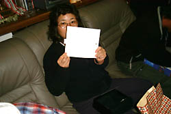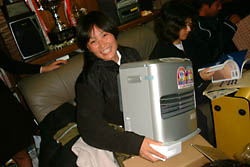 | 松原さんはなーんとシャネルのシステム手帳(?)をもらいました。でもなんか写真じゃよくわかんな〜い・・・すんませんm(__)m | 方や金指はどーんと石油ファンヒーターじゃ。今までは電気ストーブで寒さをしのいでいたという。うう・・・泣けてくる。 |