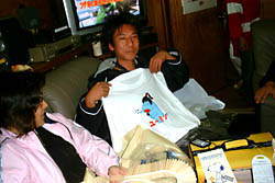 | さてさてお立会い!かねこのプレゼント、珍しく公開じゃ。このオレンジのニット、私のチョイス、グッドセンス、まさにピースでっしゃろ! | 今日はプレゼントがものすごく多くて、事務所はこのありさま。全部は写せなかったけど、もう何がなんだかわからないって感じだ。 |