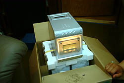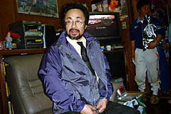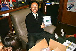 | こういうジャケット着ると、似合わない人けっこういますがやっぱり専務は「らしい」です。うーん、オトナ。 | これが例のMDコンポ本体だ。前面パネルが黄色く光るのだ。黄色だけじゃない。電源を入れると緑色やら青色やらに変わって、思わず音楽聞くのを忘れてしまいそうだ。最近のコンポは音だけじゃないんだな。 |