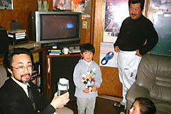 | KenさんからはMDコンポをもらわれたようです。これがまたいろいろ遊べるやつで、前面パネルが開くと・・・おっと詳しくは右下の写真で。 | ゲストとして大輝も登場だ。いつものポーズがなかったな。おすましじゃ。ちょっとオトナになったかな? |