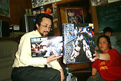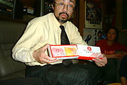 | あれ?専務ってガンプラマニアでした?実はそうらしいです。あげたのはもちろん加藤です。他にいません。これは「Zガンダム」(ゼットではなくゼータと読みゃぁせ)らしい。でもせっかく「オトナの誕生会」ってしたのに。 | なんだこりゃ?和菓子ですか?う0−ん、よくわからん。ズズーっと拡大じゃー↓↓ |