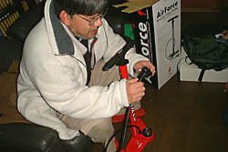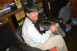 | Kenさんからはビデオデッキをもらった。こわれちゃったらしいのだ。これで連ドラもOKですね。 | 自転車マニアのGokiさん。maruからはすごい空気入れをもらった。いいのかどうかよくわからなかったが、気に入っていたようだ。 |