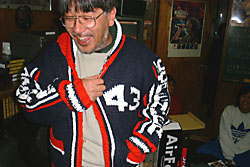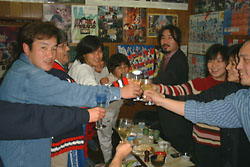 | ひろみからもらったセーターには、なんと43の文字が・・・そう、43歳になられたのではあるが・・・しかし、これって「手編み」??本人は否定していた。強く否定していた。でも、できすぎじゃない?どう思う?さわった感じも手編みだった。 | Gokiさんに酒を飲ます会発足!とうとう飲めないGokiさん、ワインを飲むハメに。このあとフラフラになったのは言うまでもない。でも飲めるようになる気がする。飲まず嫌い?はは・・・ |