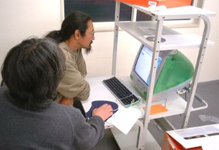 | まずQuicktime設定で挫折した三輪君に代わって松原さん登場。しかしよく分からず、苦戦。結局ユーザー登録できず。それにしてもiMacいいなあ。色がキレイ。 | さて、三輪君復活。今度は付属CD-ROMのPhotoSoapを立ち上げようとしたが、どうもドライブの速度が異常に遅い。で、見かねたgokiさん登場。これで一気に解決??・・・ | ||