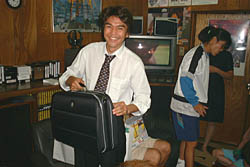 | Kenさんからは、なぜかカバンを3つももらった。買いに行ったら次々と欲しいのが出てきたからだとか。毎日替えられるね。東風平は、靴をもらったっけな。よく見てなくてすみません。 | 福ちゃんに私があげたのは、ウルトラマンのジオラマのおもちゃ(左とくらべちゃーいけません(^_^;)。それよか、白いモノ、何だと思います?これ「高周波治療器」なんだそうです。ビリビリっとくるやつらしい。うーん・・・効きそう。 |