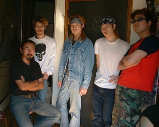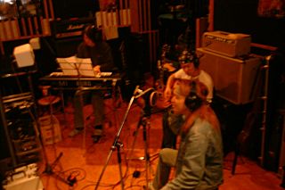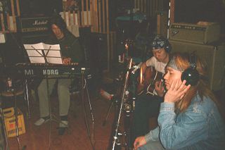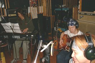 | 次第に曲が固まってきた。八大君も歌にのめりこんでいた。私はM1のピアノを使った。ロック系にはやはり欠かせないのだ。名器。 | レコーディングディレクターの三輪君とメンバー。スタジオ入口で。 |