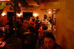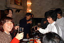 | まずは乾杯。奥でこっち見てる子が南川だ。新人。その右で手だけ見えるのが、清水。おいおい!わかるかよ。そして右奥の白い服が金指だ。ちゃんと撮れってーか??すんませんm(__)m | 店内はこんな感じでにぎやかに。手前のピンボケはこないだiBookを買って意気揚揚の長崎。 |