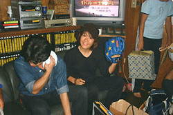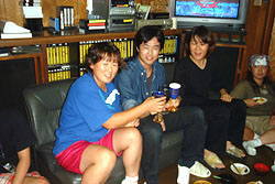 | とりあえず乾杯だ。右から長浜、ヒーロー加藤、小清水。小清水は最近髪型をちょっと変えたようです。 | 長浜は青いFukujusoグローブをもらいました。ファンキーな子です。加藤は暑いらしくて、しきりに汗を拭いていたようです。ヒーローは汗が似合う? |