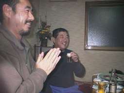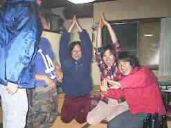 | 西村監督と福ちゃん。今年もよろしくー。合掌。 | 左から、東風平(こちんだ、ってゆーのだ。名ピッチャー。沖縄出身)、横山(ひろみ)、湯口、まっつあーん、っス。なんのヘンテツもないこの写真。ポイントは松原さんがメガネをしてないこと。最近コンタクトにしたそーじゃ。イメチェーン!でもヒロリンのへんなポーズも気になるなぁ。なにを窓から捨てたんだろう。(ちがうか・・・) |