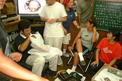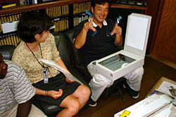 | メインはなんと言ってもこのスキャナーだ。EPSON-GT7000という600dpiの高解像度を誇るすごいスキャナーだ。こちら側はおがちゃん。 | 落合たちが何かネタをやろうとしていたら、そこへ白木が。「いやー困ったなー」という感じの落合。横山は「そうねぇー」という感じ。 |