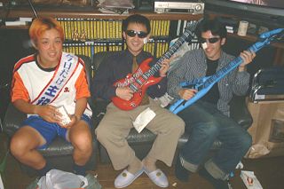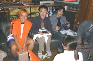 | 左から、山田、白木、ぜつお。山田はやはりオレンジものを多くもらっていたようだ。でも目がおかしくなんないか? | いきなりギター?実はこのギター、水遊びができるギターなのです。よくわかんない?うーん・・・「たすき」にも注目。 |