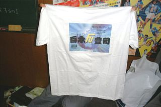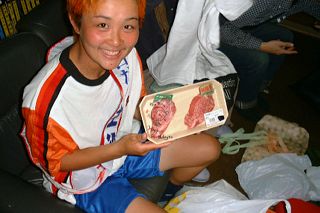 | 飛騨牛(^_^;)を瀬戸からもらって大満足の山田。肉が大好きで週に一度必ず焼肉を食べるのだそう。このパック、なんか真ん中があいてないですか?もしかして瀬戸が一個食べちゃった??本人は固く否定しておりました。 | 白木は名前入りのTシャツをもらっていた。写真はないけど、オーバーレコードのバックプリントが上下さかさまに写っていて、急遽やりなおすというハプニングもあった。いかにもオーバーらしいですね。 |