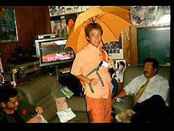 | こ、このセールスマンは誰?と驚きの貴兄もおいででしょう。さもありなん。新人の前橋と申します。よろしく!経大卒です。しかし誰かに似てるなー。あっ、そうか、シチューの歌歌ってる人!誰? | 盛り上がってきた中盤、突然暴れだした3人。もう誰も止められない!ぜっちゃんはボディーボード、やまさんは傘回し、前橋はすいかわり、とそれぞれやりたい放題!なんとかしろ〜! |