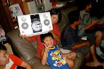 | 東風平はCD、MDプレイヤーです。かっこいいデザインですね。こんなの一体どこで見つけてくるのでしょう。大輝今日もごきげんです。この後もずっとこんな調子でした。 | これがその時計です。シルバーに輝くベルト、そしてダイヤモンドの埋め込まれた文字盤・・・かどうかは知りません。 |