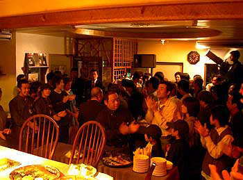 | ジャーナルに入りきれないほどのお客さんがみえました。外には特設テントも設置されています。もちろん焼きそば専門店「山田亭」も出店しています。 | さて、Kenさん登場、まずは乾杯です。おめでとうございます! |