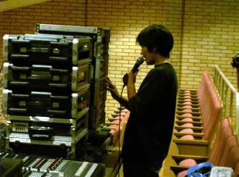 | なにやら悲しそうな表情のハム。「わからな〜い」と言いたそうです。でもいいんです。今日はお手伝いで来ているからです。山さんは最近ちょっと病気気味ですががんばっていました。 | ドラムのセッティングをする杉浦。三輪君はすでにかなり疲れていました。一方杉浦は黙々と作業をするタイプです。「わからな〜い」とは言わないようです。 |