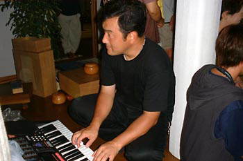 | 大海にサングラス。よくその道の方と間違えられるそうですが分かる気もします。「おじぎされる」んだそうです(大汗 | 隆司にキーボード。似つかわしくない、そうお思いでしょう。しかし・・・なんとウィンダムヒルの曲(誰だっけ?)を弾けるのです。よく聞くあれです。 |