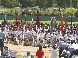 | 灼熱のグラウンドの行進も終わり、灼熱の中での開会宣言、優勝旗返還、などが続きます。すでにKは熱中症にかかってます。でもさすがに若い子達は大丈夫そうですね。 | とはいえ何人か倒れた子もいます。岐阜の暑さは全国3位だとか、みんな十分気をつけて試合がんばってください。 |