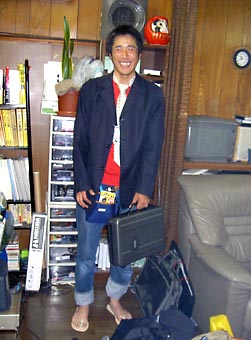 | 続いて新人の宇佐美「ひろ」君です。営業修行中ということで、こんな格好してもらいました(?)わらじでどこまでも行くぞ!というくらいの勢いのあるやつです。よろしく!「ゼロハリバートン」をいただきました。 |