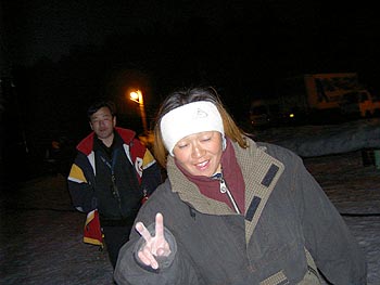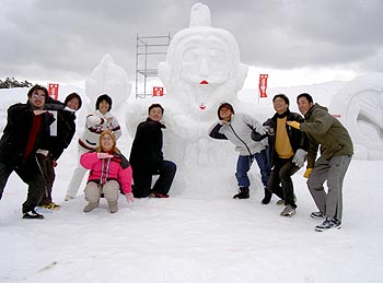 | レーザーショウもFukujusoも無事終了し、次の日雪像の前でアイーンをするみんな。Kもはいれと言われましたが、そんな、アイーンなんて、僕はできません!(とは言え、やらせたのは私です) | イベント最後には雪像コンテストの表彰式が行われ、シメとしてFukujusoミニステージがありました。音はオケなのでKも応援です。 |