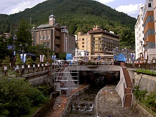 | Kが到着する前にかなり雨が降ったという下呂。天気が持つといいけど。ところでこの光景、もうおなじみになりましたね。 | 下呂温泉といえば老舗旅館「小川屋」です。今年もここには泊まれませんでした。いつかはみんなで一泊しよう! |