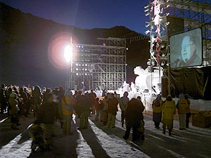 | 晴れたスキー場の夜の寒さを初めて体感いたしました。もう足は凍っています。ステージでは、姉妹都市との交流が行われています。 | イベントMCはおなじみ、みろくの藤田さんです。このあと怒涛の零下15度ライブ、零下15度レーザーショウ「福寿草の咲く丘」があり、花火でしめくくられました。 |