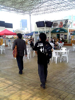 と、もう行くところもなくなってブラブラする男衆。福ちゃんと長崎の後姿をとらえてみました。食べ物屋さんのあたりには子供連れ家族がちらほらとみえました。 |
