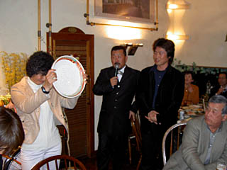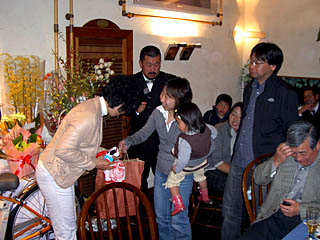 | いい家族二軒目。小川家です。東風平の姿が見えませんがちゃんと来ておられました。ところで大輝といえば三線はあれから練習してるかな? | いい家族三軒目・・・といきたかったが今日はひとり?橘からは、NIKEのシューズ。橘はバスケットボール選手マイケルジョーダンの大ファンです。 |