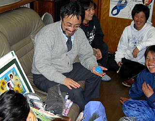 | こう見えて専務はおじいちゃま、もう孫がいます。オーバー唯一の孫持ちということでみんなからカスタネットで遊びましょう!と誘われて・・・ | いやー困ったなー、肩が凝るんだわぁ。とさっそく肩のマッサージを始めました。でも家に帰ったら本当の孫の手が待ってますよ。 |