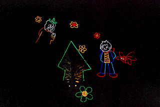 | 少年クリンが、フクロウやクジラと供に大冒険。子供たちに大人気でした。 | 中央通路には電飾のオブジェがずらり。まるでライトミュージアム。 |