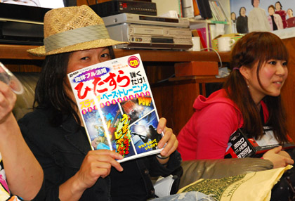 | 学園祭の女王、湯口のプレゼントは、あの、iPho〜〜ン。これで事務所二人目。ほしい! | リュックなどバッグ類をいただいた学祭実行委員の林。この他キャラクターTシャツなど多数もらっていたようです。 |