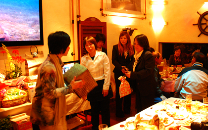 | 最後は上野さん。高級ワインのプレゼント。新装ジャーナルもがんばってください。16日オープン! | ここで突然アトラクション。「誰かの」ママさん、持ち芸を披露。大盛り上がり。 |