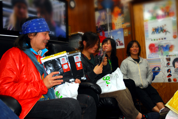 | 西本さんと松原さんからはダウンジャケットをいただきました。上野さんっぽい! | 工藤はいつの間にか放浪セット完成。しかしこの二人、ポーズも似てるし、話し方も似ているなー。 |