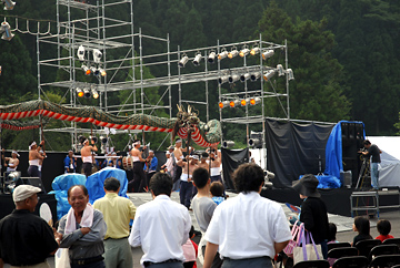 | 午後5時、まずは龍神が登場し場内を盛り上げます。 | こちらはよさこいチーム「揖斐川MAX」のみなさんの演舞。「美濃の揖斐川」も久々に聞きました。5曲演舞というのはハードでしょう。 |